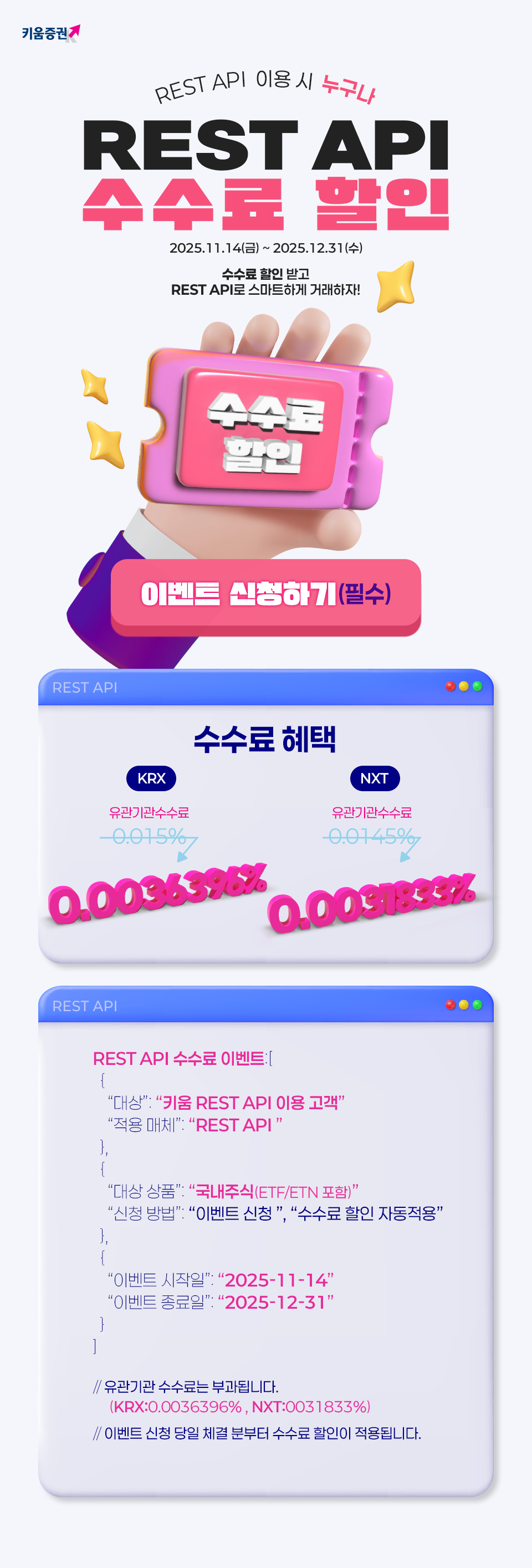 본 이벤트의 수수료 할인 혜택 적용 매체는 REST API 입니다. (단, 유관기관 수수료 및 제비용 제외)