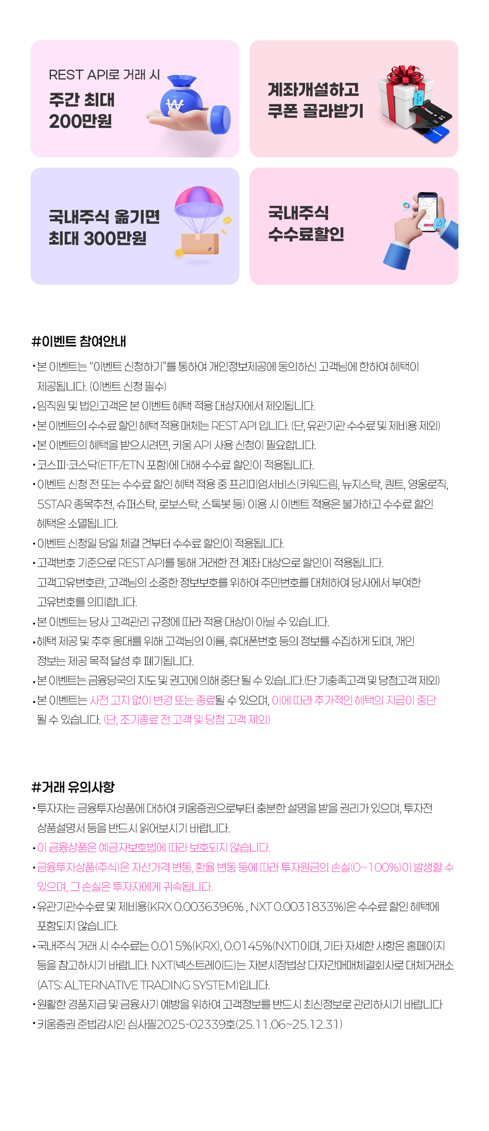 유관기관수수료 및 제비용(KRX 0.0036396% , NXT 0.0031833%)은 수수료 할인 혜택에 포함되지 않습니다.