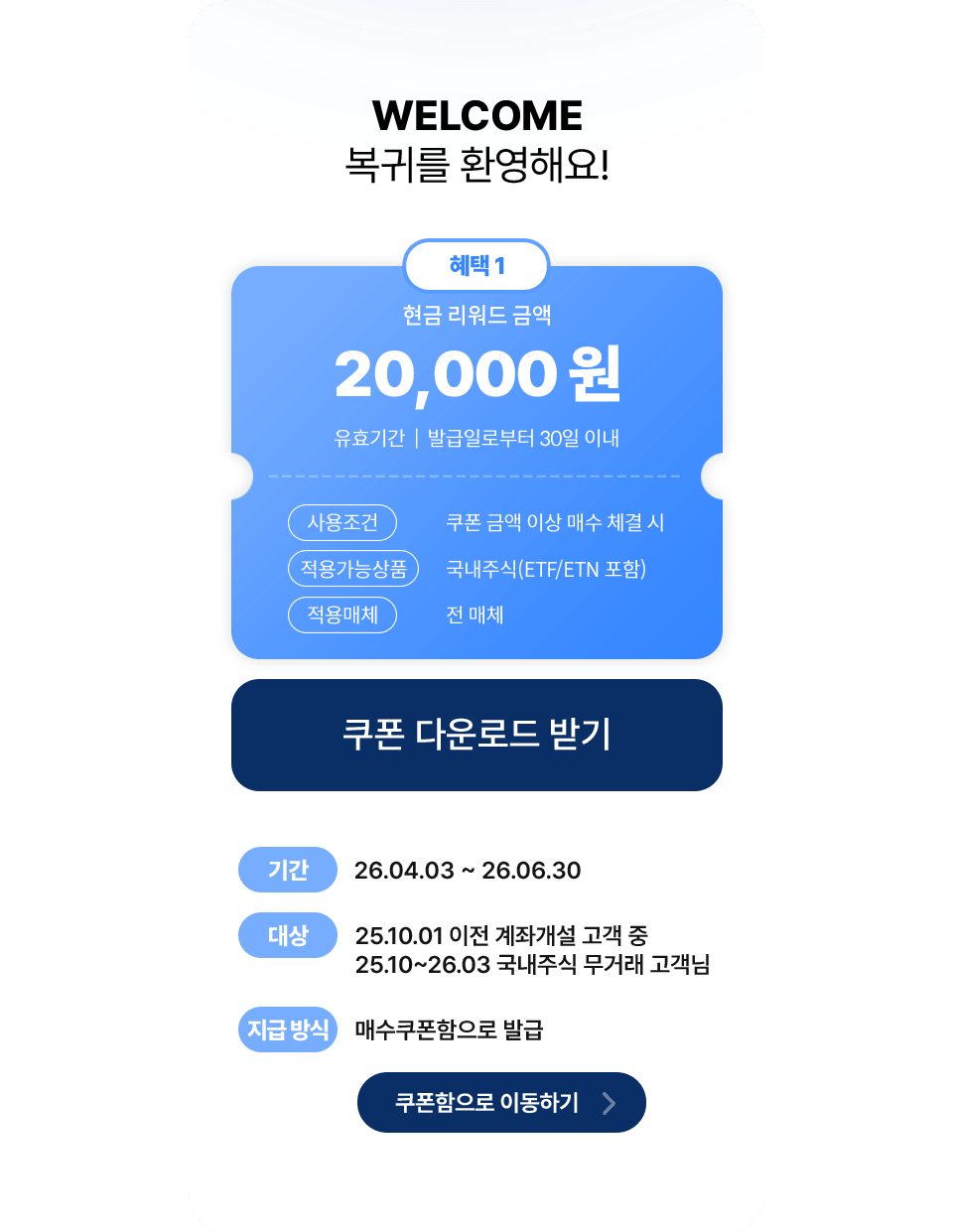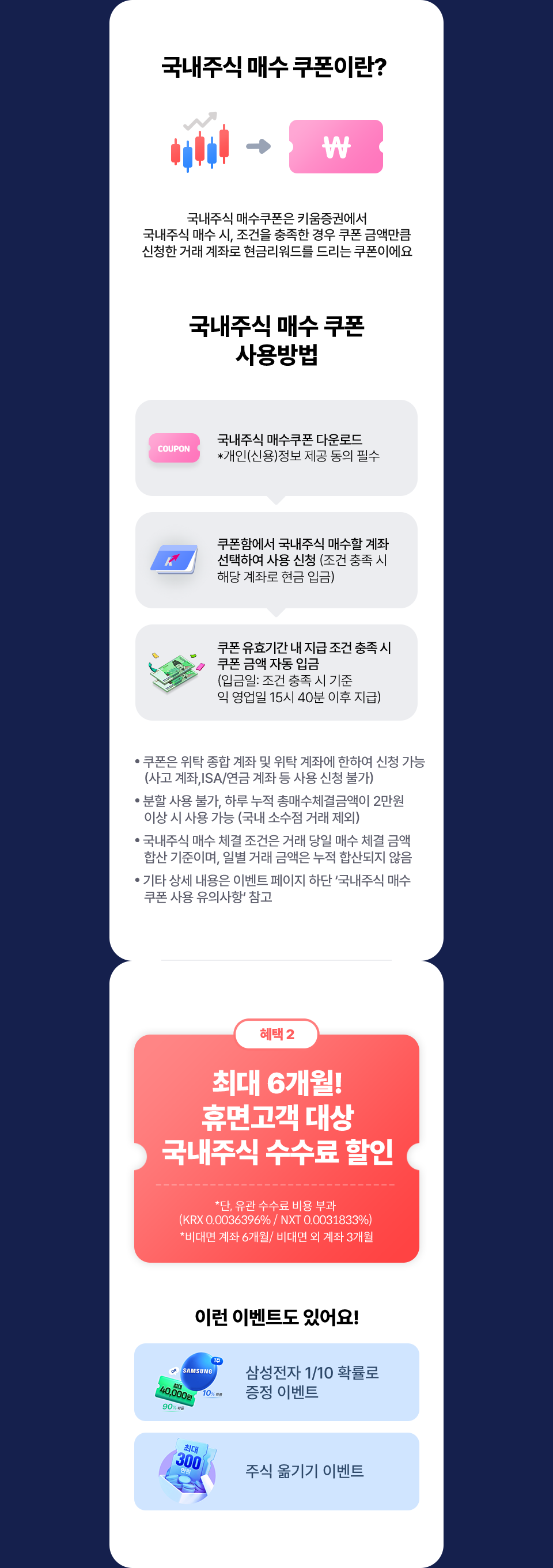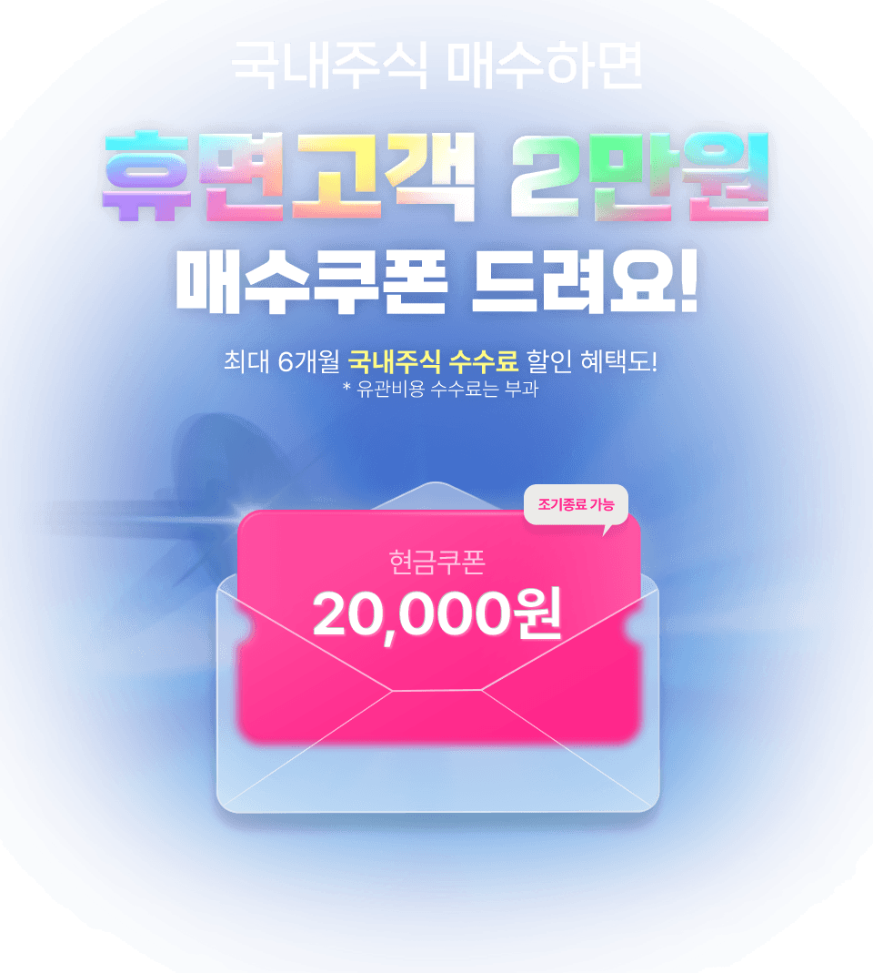 키움증권 휴면 고객이라면, 국내주식 2만원 매수 쿠폰 바로 드림! (선착순 0,000명 지급) 키움 REST API 최초 거래 고객이라면, 국내주식 1만원 매수 쿠폰 바로 드림! (선착순 0,000명 지급) 키움증권 신규 고객이라면, 국내주식 1만원 매수 쿠폰 바로 드림! (선착순 0,000명 지급) 키움 간편모드 거래 고객이라면, 국내주식 1만원 매수 쿠폰 바로 드림! (선착순 0,000명 지급) 국내주식 매수 쿠폰이란? 국내주식 매수 쿠폰은 키움증권에서 국내주식 매수 시, 쿠폰 금액만큼 신청하신 거래 계좌로 현금 리워드를 지급해드리는 쿠폰이에요 국내주식 매수 쿠폰 사용 방법 ① 국내주식 매수 쿠폰 다운로드 * 개인(신용) 정보 제공 동의 필수 ② 국내주식 매수할 계좌 선택하여 사용 신청 (해당 계좌로 현금 입금) ③ 쿠폰 유효기간 내 지급 조건 충족 시 쿠폰 금액 자동 입금(입금일 : 지급 조건 충족일 기준 익 영업일) * 쿠폰은 위탁 종합 계좌 및 위탁 계좌에 한하여 신청 가능 (ISA/연금 계좌 등 사용 신청 불가) * 쿠폰은 분할 사용할 수 없으며, 매수 주문 금액 이상 예수금이 있어야 사용 가능 * 기타 상세 내용은 이벤트 페이지 하단 ‘국내주식 매수 쿠폰 사용 유의사항’ 참고 국내주식 매수 쿠폰 사용 유의사항 ● 국내주식 매수 쿠폰은 개인(신용)정보 제공에 동의하신 고객님에 한하여 지급 및 사용 가능합니다. ● 쿠폰은 키움증권 계좌를 보유한 고객에 한하여 지급 및 사용 가능하며, 임직원 및 법인 고객은 쿠폰 지급 대상에서 제외됩니다. ● 쿠폰 지급 이벤트는 이벤트 기간 이후에는 발급 불가하며, 이벤트별로 고객 번호 기준 1건만 발급 가능합니다. ● 쿠폰 지급 이벤트는 사전 고지없이 변경 또는 종료될 수 있으며, 이에 따라 추가적인 혜택의 지급이 중단될 수 있습니다. (단, 조기종료 전 쿠폰 발급 및 혜택 지급 대상 고객은 제외) ● 국내주식 매수 쿠폰 적용 가능 상품(쿠폰 발급 조건에 따라 상이할 수 있음) - 국내주식 쿠폰(ETF/ETN 포함): 국내주식(코스피/코스닥/ETF/ETN 포함) *코넥스/ELW/금현물 등 제외 - 그 외 쿠폰은 적용 가능 상품 구분에 따라 적용 (ex. 국내 ETF/ETN 전용 쿠폰 등) ● 발급받은 쿠폰은 ‘사용하기‘ 화면에서 사용 등록(계좌 선택 필수) 후 사용 가능합니다. ● 쿠폰 사용 신청은 위탁 종합 계좌 및 위탁 계좌에 한하여 가능합니다. (폐쇄 계좌, ISA/연금 계좌 등은 사용 신청 불가) ● 쿠폰은 분할 사용할 수 없으며, 매수 주문 금액 이상 예수금이 있어야 사용 가능합니다. ● 쿠폰 사용 완료 시, 사용 신청한 매수 발생 계좌로 익 영업일에 현금 Pay-Back 금액이 지급됩니다. (당일 거래분은 거래 당일 24:00 전까지 사용 신청 완료한 쿠폰에 한하여 소급 적용) ● 쿠폰은 사용 등록 이후 취소 불가하며, 등록한 쿠폰 사용 완료 이후에 다른 쿠폰을 등록하실 수 있습니다. ● 쿠폰 현금 지급액은 기타소득금액에 포함되며, 연 300만원 초과 기타 소득의 경우 종합소득세에 포함되어 과표 기준이 달라질 수 있습니다. (당사에서 기타소득 신고 납부 후에는 당사 귀책사유가 아닌 경우 정정 및 취소 불가) ● 쿠폰 현금 입금 시 계좌 폐쇄 등의 사유로 현금 입금이 불가할 경우 혜택 지급 대상에서 제외될 수 있습니다. ● 쿠폰 유효기간, 사용조건, 적용 가능상품, 적용 매체 등 쿠폰 사용 세부 이용 조건을 반드시 확인하고 사용하시기 바랍니다. ● 본 이벤트와 관련한 문의 사항은 키움금융센터(1544-9000)를 통하여 안내받으실 수 있습니다. 투자유의사항 ● 투자자는 금융투자상품<주식, ETF, ETN>에 대하여 키움증권으로 부터 충분한 설명을 받을 권리가 있으며, 투자 전 상품설명서, (간이) 투자설명서, 집합투자규약 및 약관 등을 반드시 읽어보시기 바랍니다. ● 이 금융상품은 예금자보호법에 따라 보호되지 않습니다. ● 금융투자상품은 자산가격 변동, 환율 변동, 신용등급 하락, 괴리율 등에 따라 투자원금의 손실(0~100%)이 발생할 수 있으며, 그 손실은 투자자에게 귀속됩니다. ● 국내주식 거래 시 수수료는 0.015%(KRX), 0.0145%(NXT)이며, 기타 자세한 사항은 홈페이지 등을 참고하시기 바랍니다. NXT(넥스 트레이드)는 자본시장법상 다자간매매체결회사로 대체거래소(ATS: Alternative Trading System)입니다. 한국거래소(KRX) 수수료 한시적 인하 기간('25.12.15~'26.02.13)에는 주식 거래 수수료가 0.0145%입니다. 해당 기간 이후 수수료가 변동될 수 있습니다. ● 증권거래비용, 기타비용이 추가로 발생할 수 있습니다. ● ETF 거래수수료가 별도로 발생할 수 있습니다. ● ETN은 발행사(키움증권 신용등급:AA-, 2024.06.21, 한국신용평가) 의 신용위험(부도 또는 파산 등)에 따른 원금손실이 발생할 수 있습니다. (투자적격등급은 AAA/AA·A·BBB 각 +, 0, - 순으로 구분) ● ETN 매매 시 거래수수료는 0.015%이며, 총보수 등이