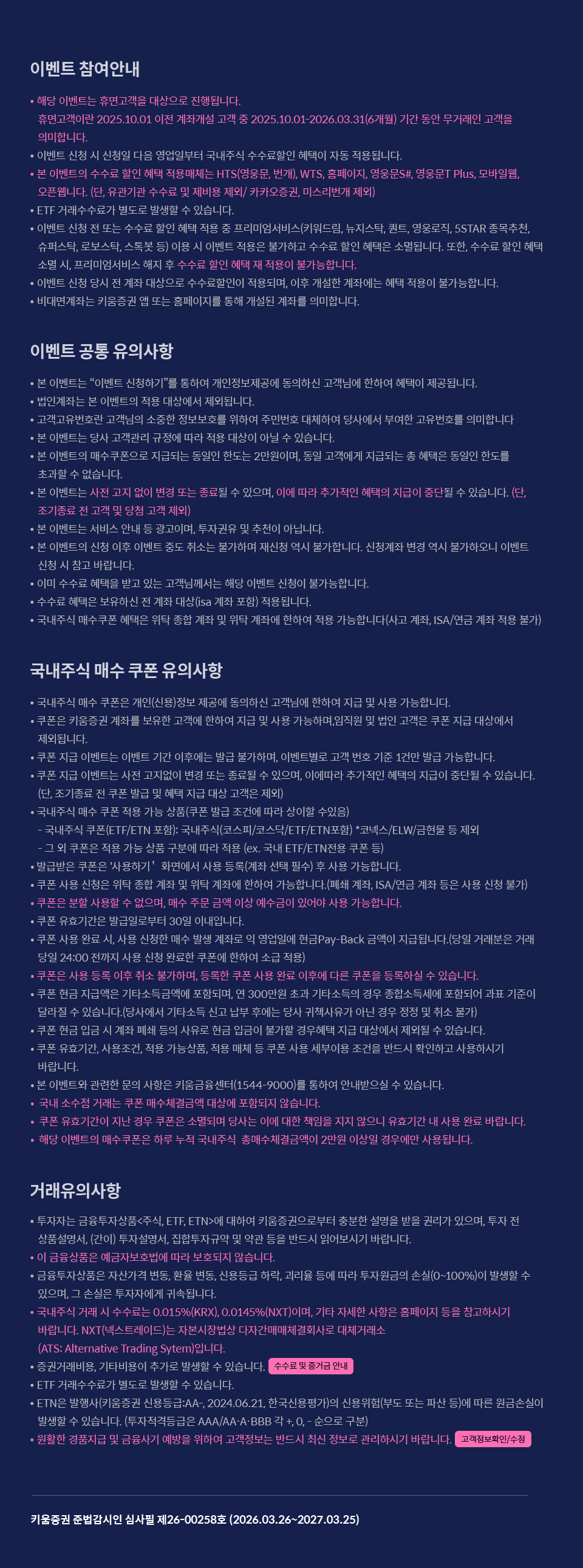 추가로 발생할 수 있습니다. 한국거래소(KRX) 수수료 한시적 인하 기간('25.12.15~ '26.02.13)에는 ETN 거래 수수료가 0.0145%입니다. 해당 기간 이후 수수료가 변동될 수 있습니다. ● 원활한 경품지급 및 금융사기 예방을 위하여 고객정보는 반드시 최신 정보로 관리하시기 바랍니다. 키움증권 준법감시인 심사필 제00-00000호(2025.12.04~2026.12.03)
