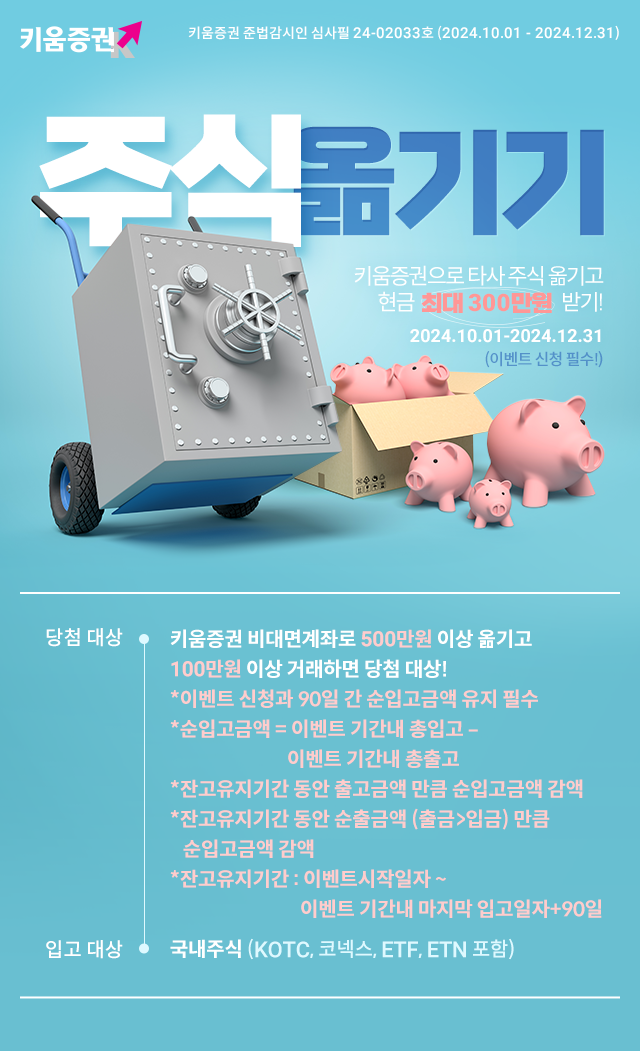 - 주식옮기기 이벤트는 이벤트 신청, 입고, 거래의 순서와 상관없이 신청하신 고객님의 이벤트 기간 동안의 입고/출고/거래액을 모아 집계합니다. 따라서 입고하시거나 거래하신 뒤에 신청하시더라도, 이벤트 기간 내이면 모두 인정됩니다.