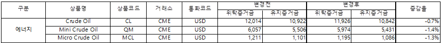 ☞ 증거금 변경 내역 : ![]() ※ 미국-이란 전쟁 이슈로 시장 변동성 확대에 따라 에너지 상품은 증거금이 수시로 변경 가능합니다. ※ 변동성 증가로 증거금 상향 변경 시 장시작과 동시에 실시간 반대매매 및 추가증거금이 발생되어 반대매매 처리될 수 있습니다. 금일 장종료 시 미결제약정 보유하시는 것을 자제하여 주시기 바랍니다. ※ 해외선물옵션 증거금 변경 - 변경주기 : 매주 화요일 + 수시 변경 (시장 변동성이 큰 경우) □ 증거금 확인 경로 - 영웅문G > [0773] 해외선옵 상품별 증거금 - 영웅문SG > 해외선물옵션 > 상품정보 > 상품증거금 ☞ https://invest.kiwoom.com/inv/m/074/sg - 홈페이지 > 이용가이드 > 수수료/증거금 > 해외선물옵션 □ 유의사항 미결제수량을 보유하신 경우, 이하 공지사항을 확인해주시기 바랍니다. - 영웅문 G > [0010] Front Page 공지사항 - 영웅문 SG > 업무 > 공지/이벤트 > 공지 ☞ https://invest.kiwoom.com/inv/m/182/sg |